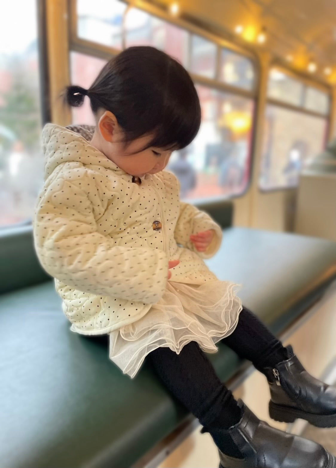 通常価格 ¥5,886もこもことしたドット柄のキルティングが愛らしい、フード付きジャケット。
