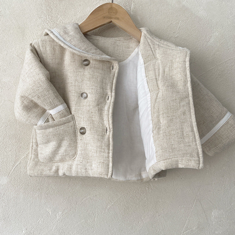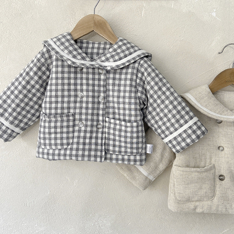 大きなセーラー襟とダブルボタンが特徴の、クラシカルでアカデミックな雰囲気のジャケット。 チェック柄と無地のリネン風素材の2種類があり、インナー次第で幅広い着こなしが楽しめます。 軽やかな素材感で、季節の変わり目の羽織りとして重宝するアイテムです。