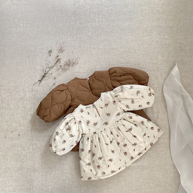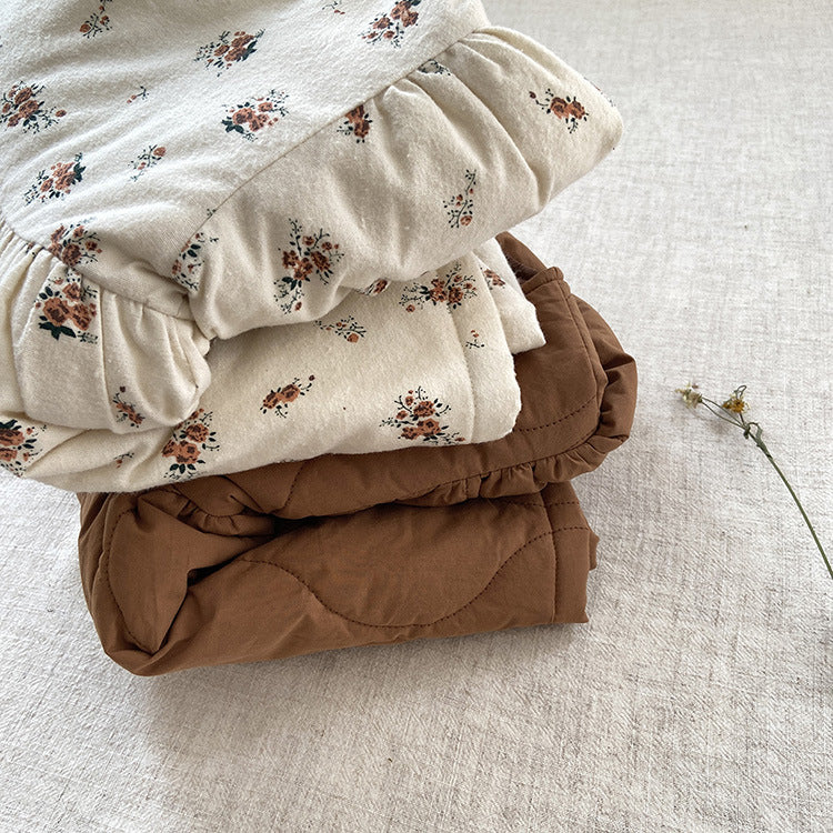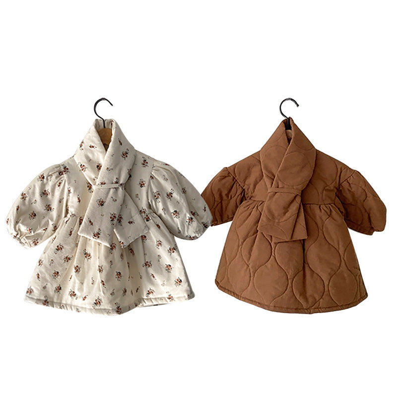 ふんわりとしたシルエットと、取り外し可能なマフラーがセットになった愛らしい中綿ジャケット。 キルティング加工で暖かく、寒い季節のお出かけに欠かせないアイテムです。 小花柄と無地ブラウンの2色展開で、コーディネートに合わせて選べます。