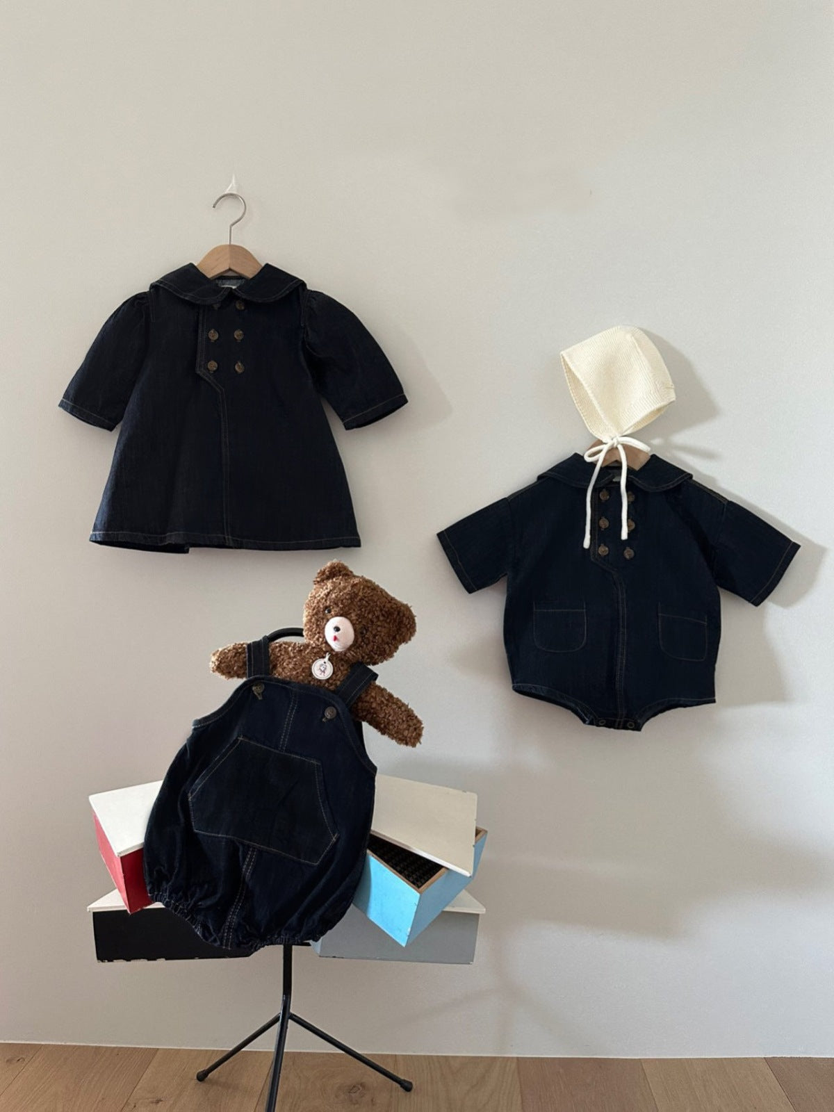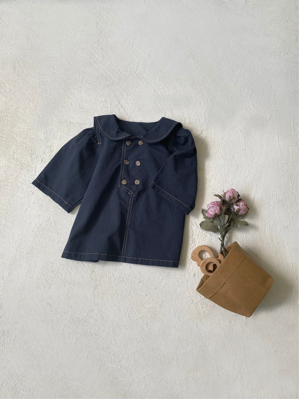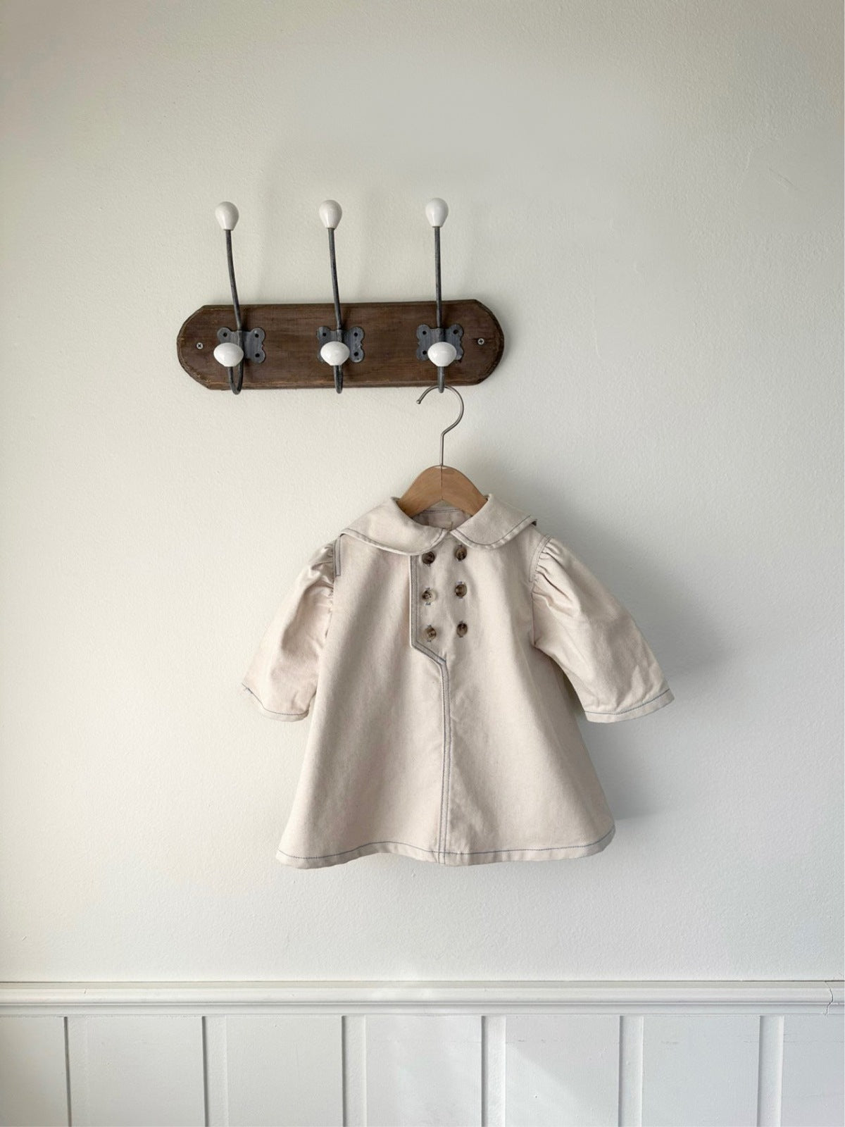 大きな襟とダブルボタンが目を引く、セーラー風デザインのコートワンピース。