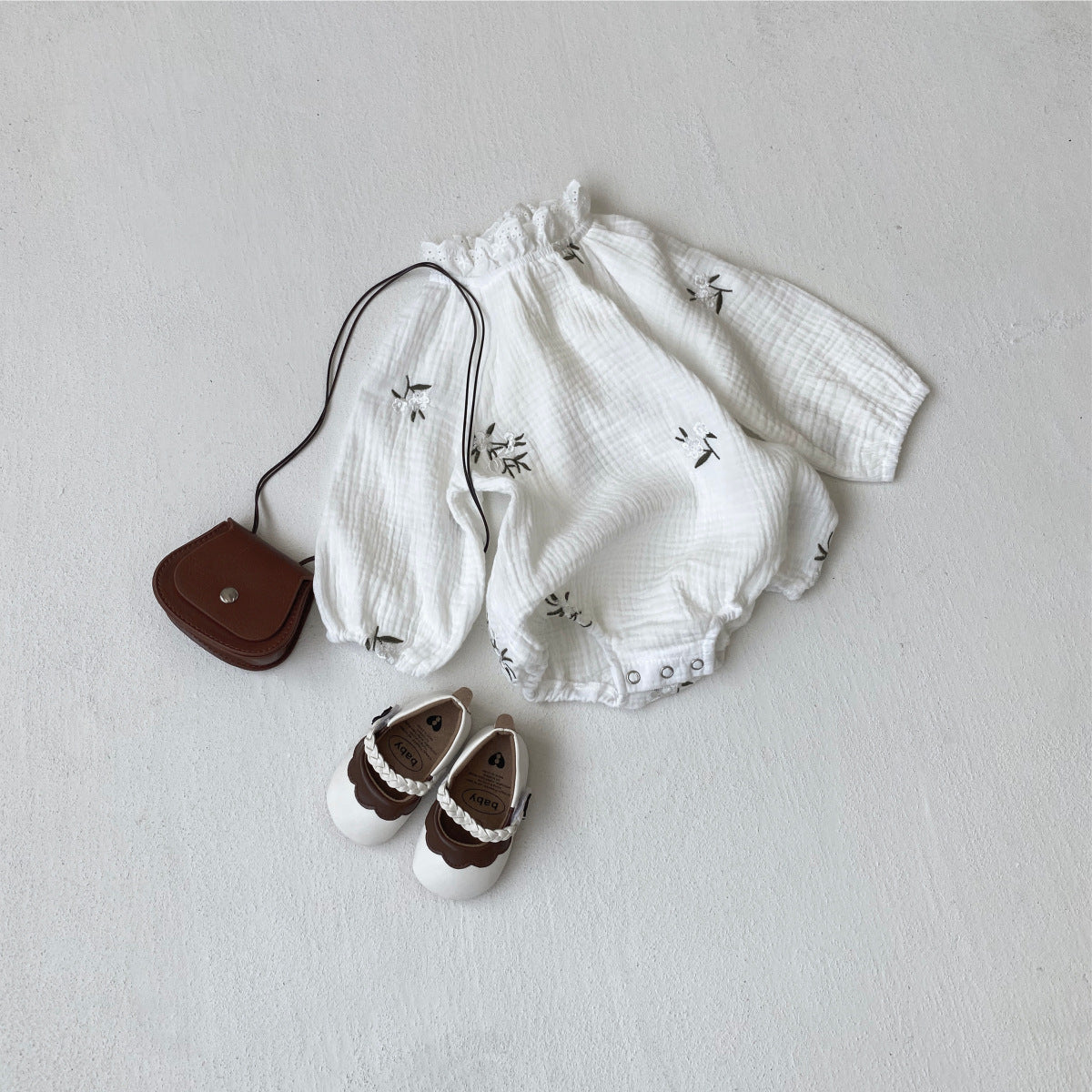繊細な花刺繍をあしらったロンパース。フリルハイネックとバルーンシルエットが、ベビーを優しく包み込む、クラシカルで愛らしい一着です。