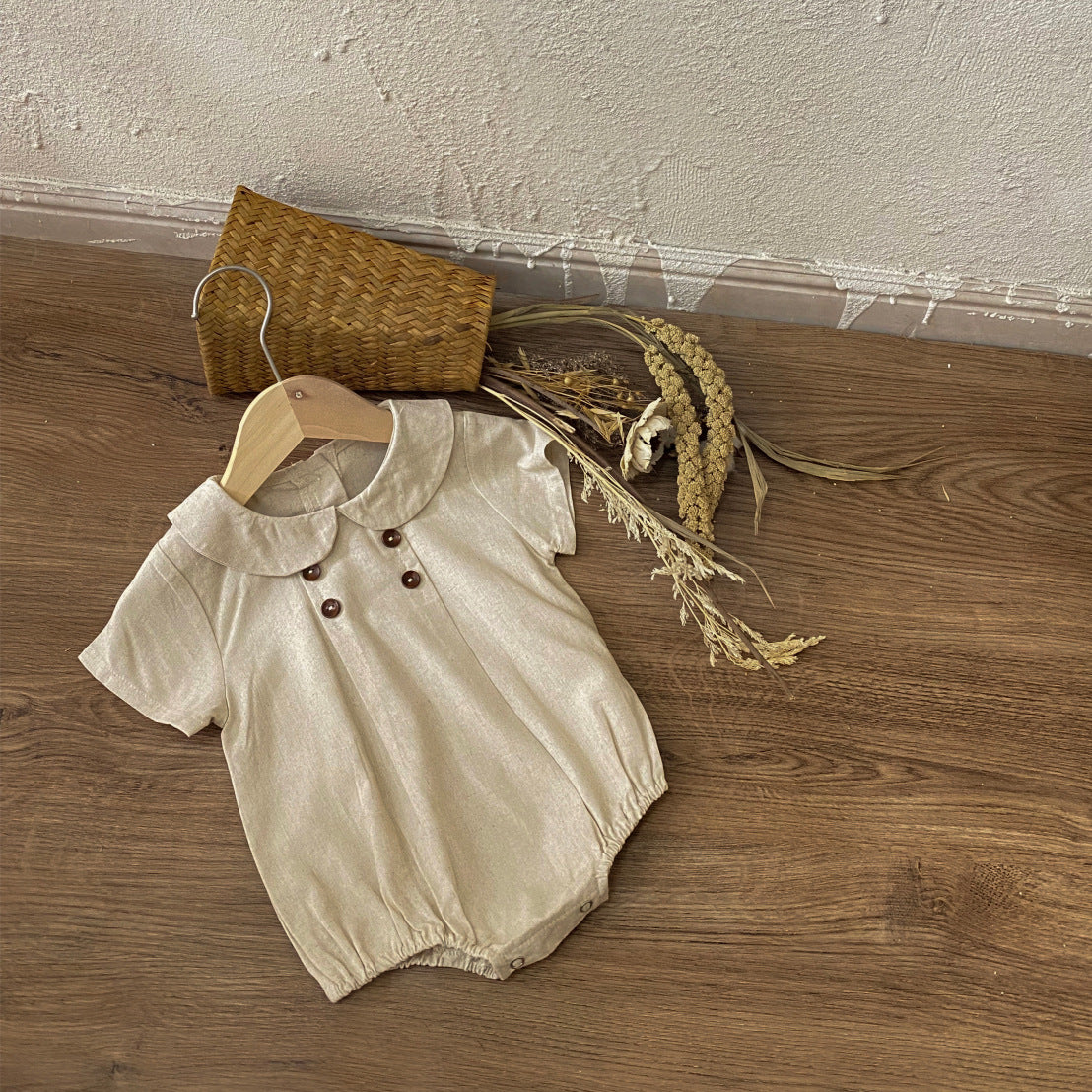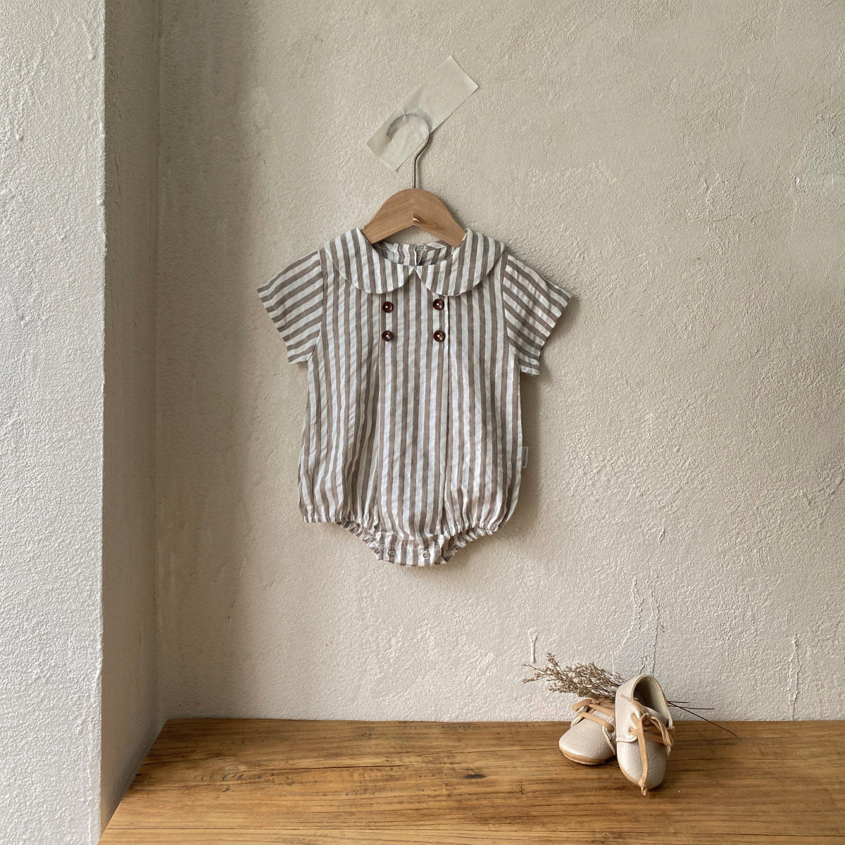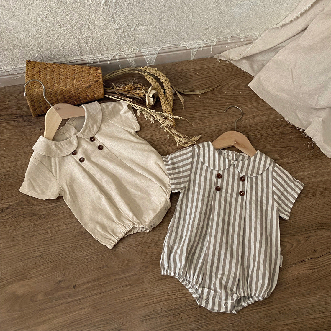 大きな丸襟とウッド調のボタンが可愛らしい、ベビー用半袖ロンパース。シンプルで上品な無地と、爽やかなストライプ柄の2タイプをご用意しました