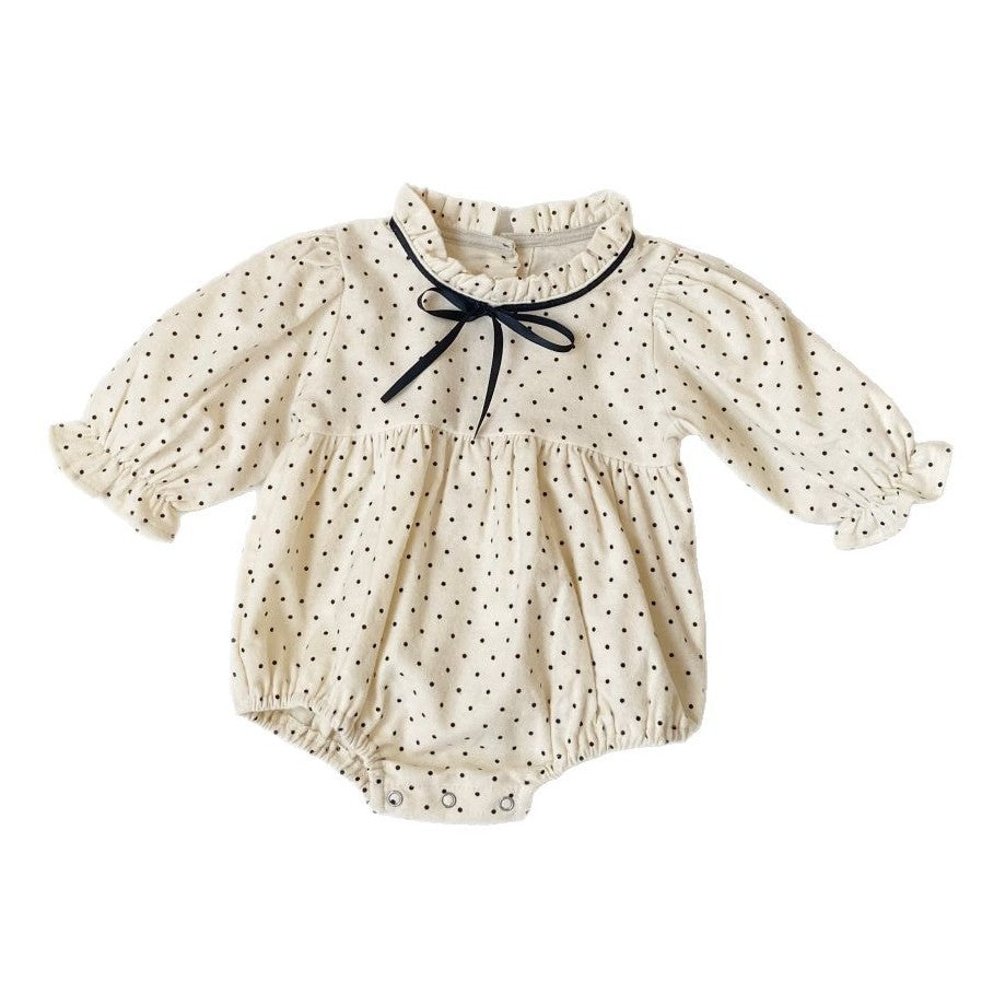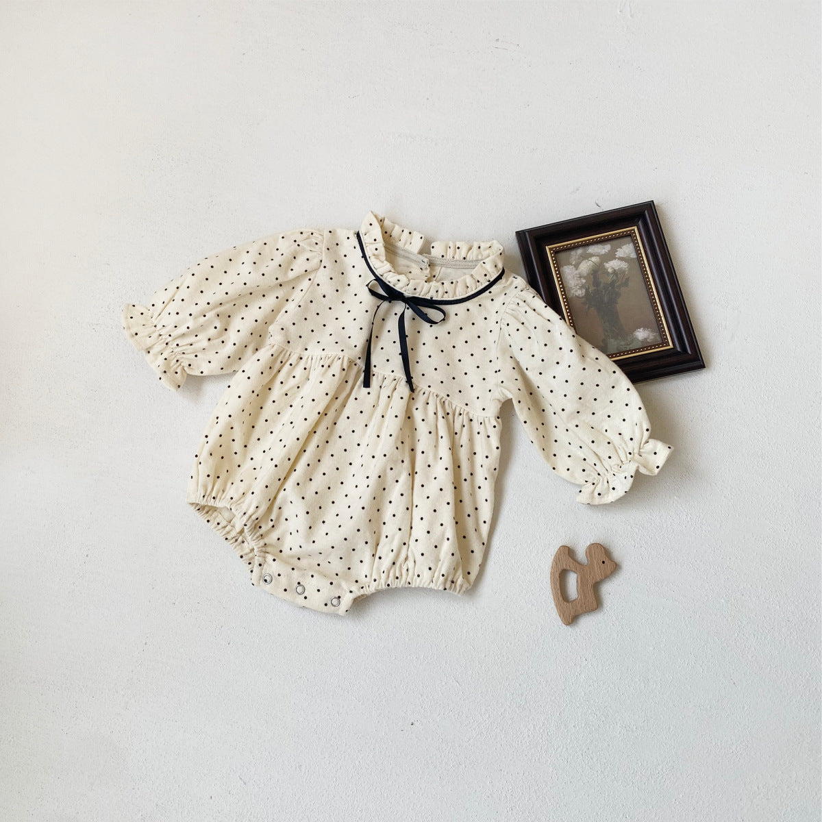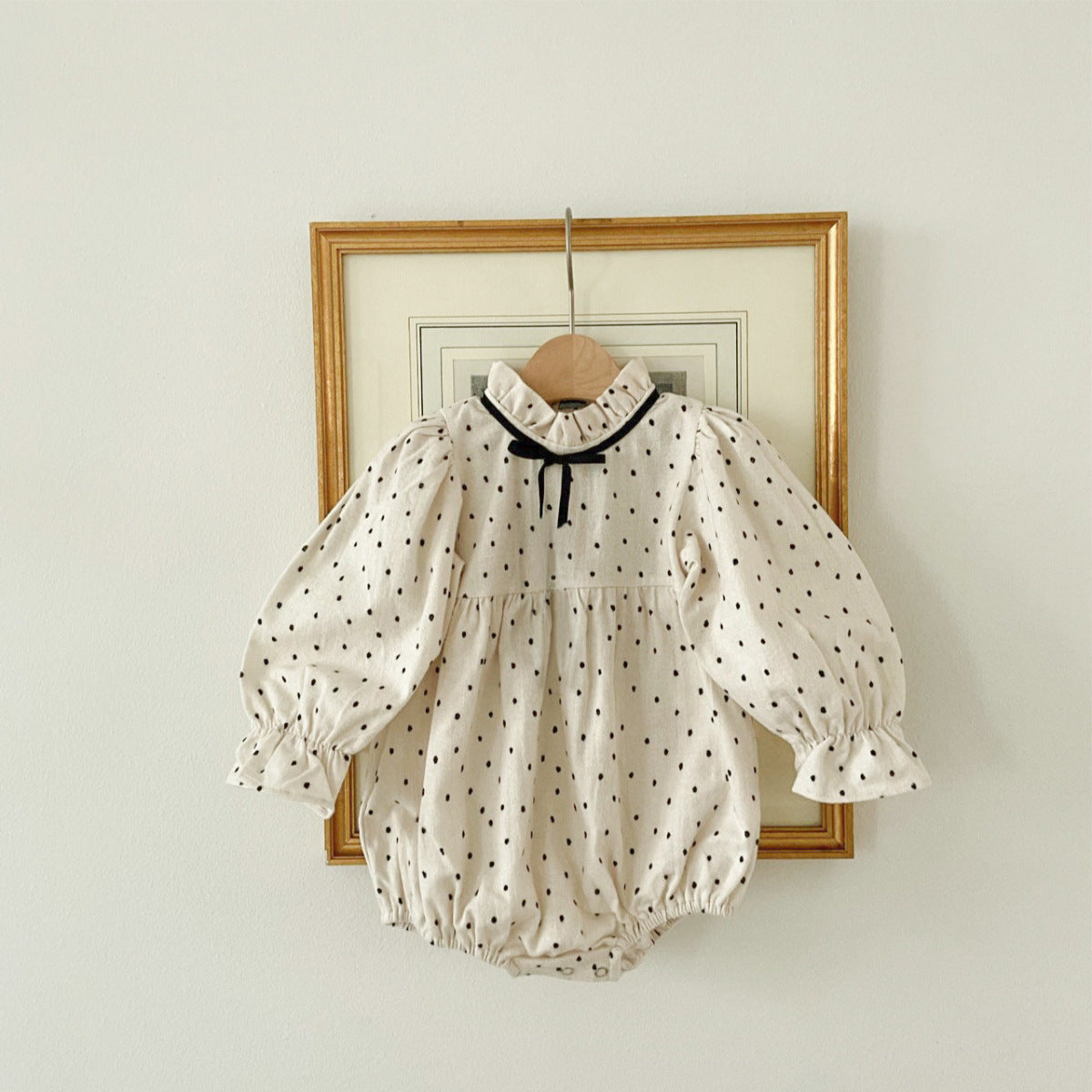 小さなドット柄と、首元・袖口のフリルがクラシカルで愛らしいロンパース。 首元の黒いリボンがアクセントになり、上品で清楚な印象を与えます。 ゆったりとしたシルエットで、ベビーを可愛らしく包み込む一枚です。