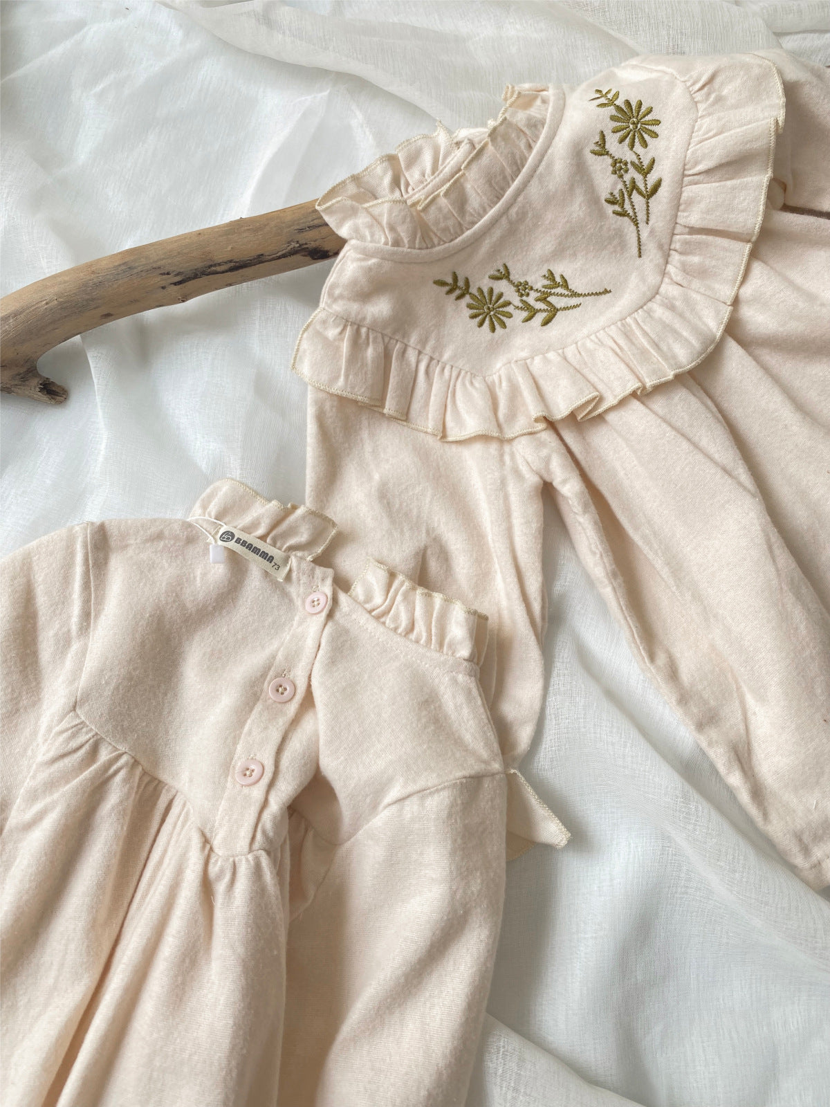 大きなフリル襟と胸元の素朴な刺繍がクラシックな雰囲気を醸し出すワンピース。 暖かみのある起毛感のある生地を使用し、秋冬のおしゃれにぴったりです。 落ち着いた色合いで、上品なコーディネートが完成する一枚です。