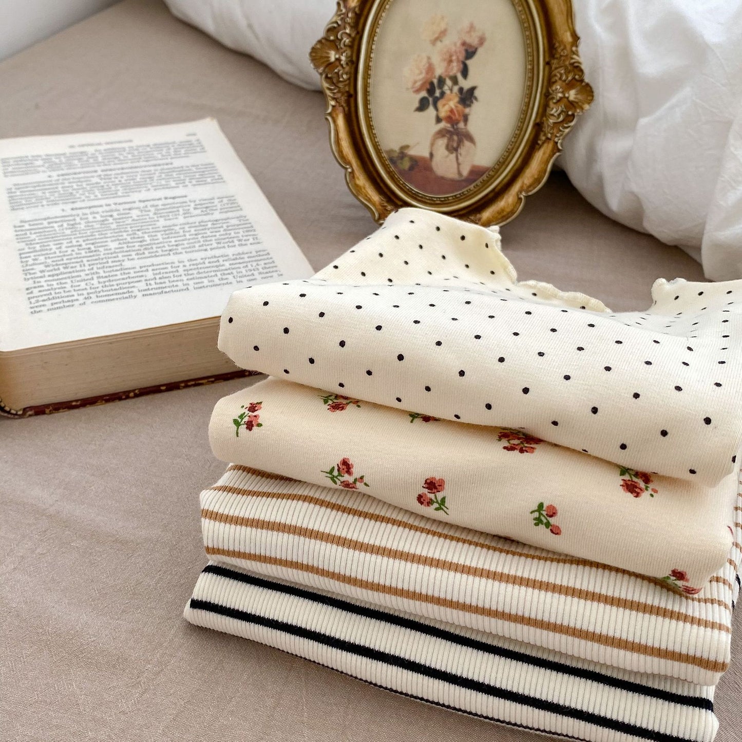 首元と袖口のメロウフリルが可愛らしい、リブ素材の長袖トップス。