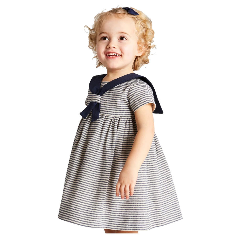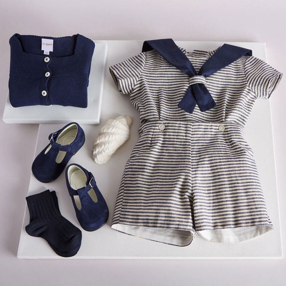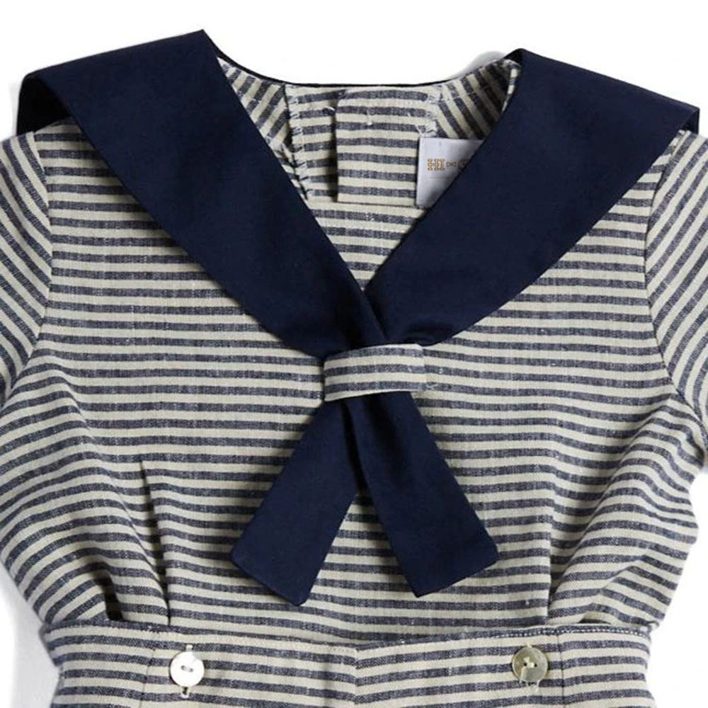爽やかなストライプとネイビーのコントラストが魅力のマリンシリーズ。 ワンピースとセットアップの2型展開で、姉弟・兄妹でのリンクコーデも楽しめます。 潮風を感じる上品なセーラー襟のデザインが、夏の装いをクラシックで特別なものに仕上げます。