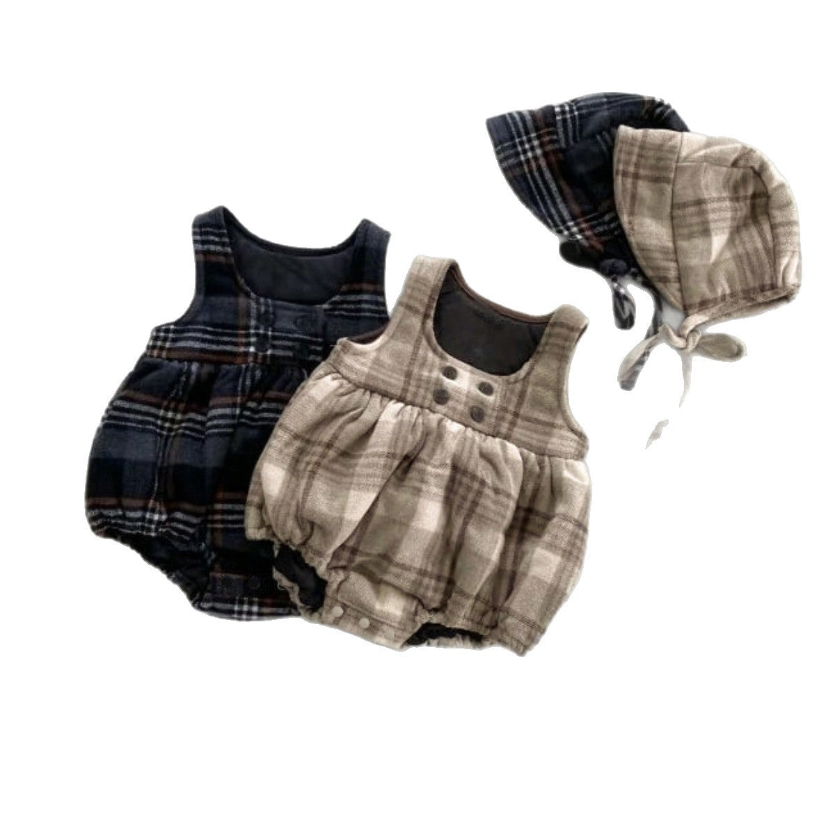ふんわりとした丸いフォルムが可愛いロンパースと、お揃いのボンネット(帽子)の2点セットです。 フロントのボタンデザインと落ち着いたチェック柄が、クラシカルで上品な雰囲気を演出します。 セットで着るだけで特別感のあるコーディネートになり、バースデーフォトやギフトにも最適です。